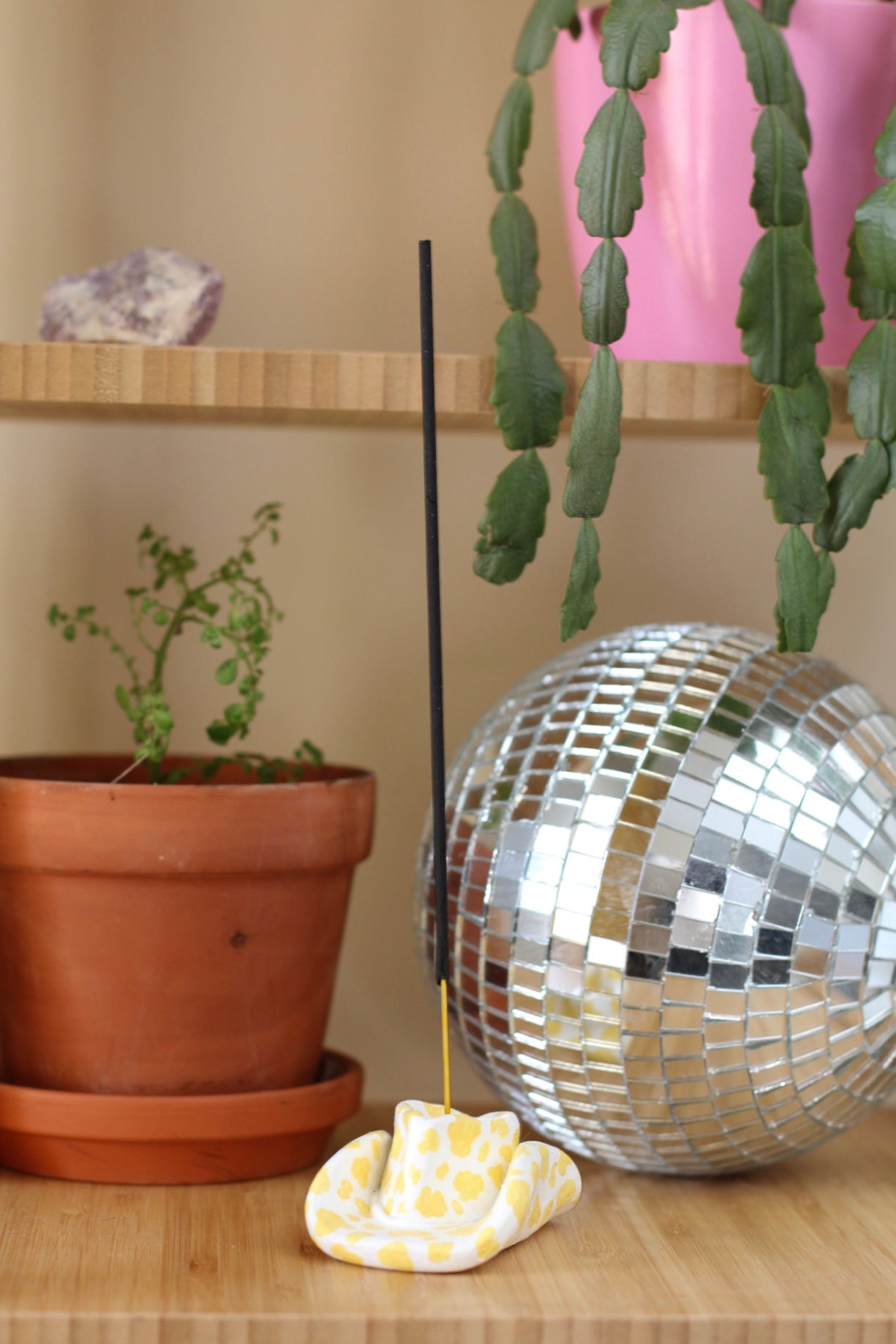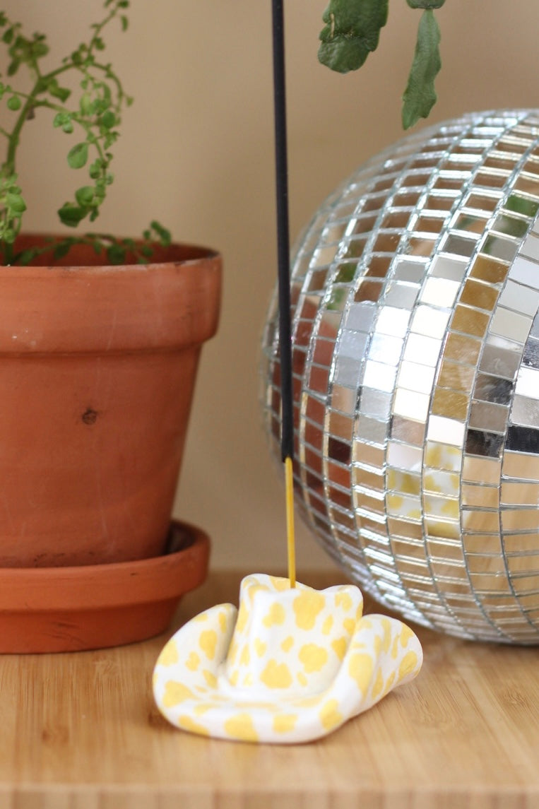 Hand formed, hand painted clay incense holder. Burn your favourite incense in this cutie yellow cow print cowboy hat holder. Yeehowdy!